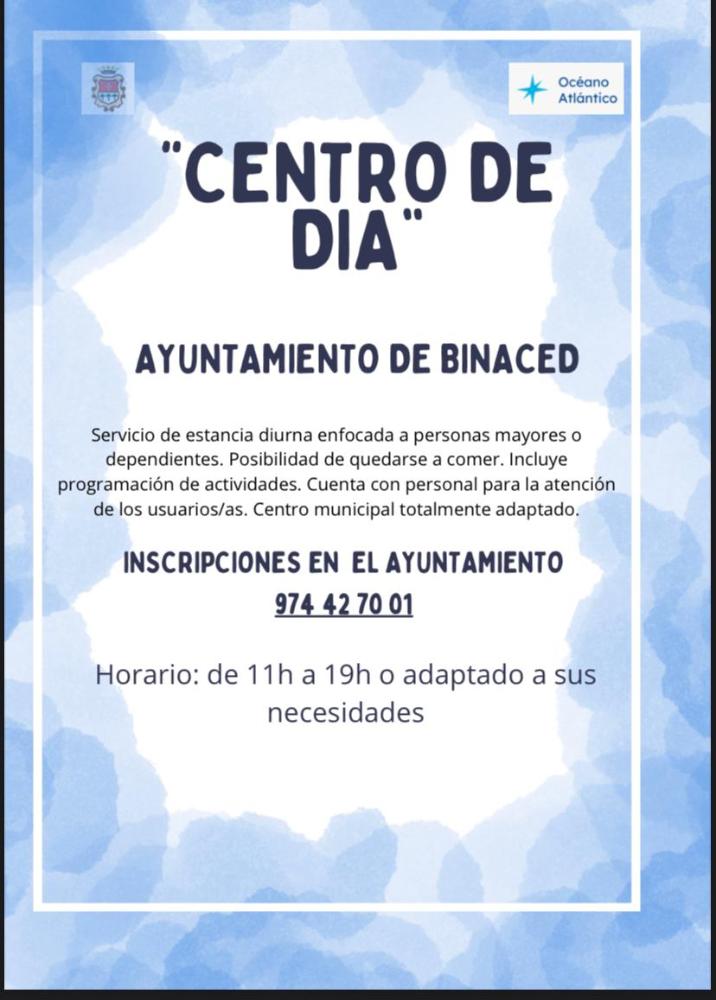 "CENTRO DE DÍA", AYUNTAMIENTO DE BINACED Whatsapp: "CENTRO DE DÍA", AYUNTAMIENTO DE BINACED Fecha 07 mayo 2024 Inscripciones en el Ayuntamiento Servicio de estancia diurna enfocada a personas mayores dependientes. Posibilidad de quedarse a comer. Incluye programación de actividades. Galería imágenes cat: Servicios, vaobulcary: 2663117