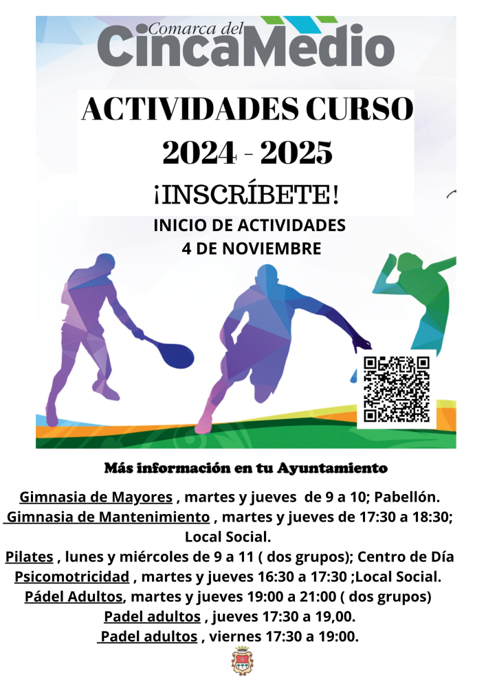 Os recordamos que el Lunes 4 de noviembre empiezan las actividades deportivas de Comarca: Gimnasia de Mayores, martes y jueves va de 9 a 10; Gimnasia de Mantenimiento , martes y jueves de 17:30 a 18:30; . Pilates , lunes y miércoles de 9 a 11 ( dos grupos). Psicomotricidad , martes y jueves 16:30 a 17:30 . Pádel Adultos, martes y jueves 19:00 a 21:00 ( dos grupos); jueves 17:30 a 19; viernes 17:30 a 19:00.