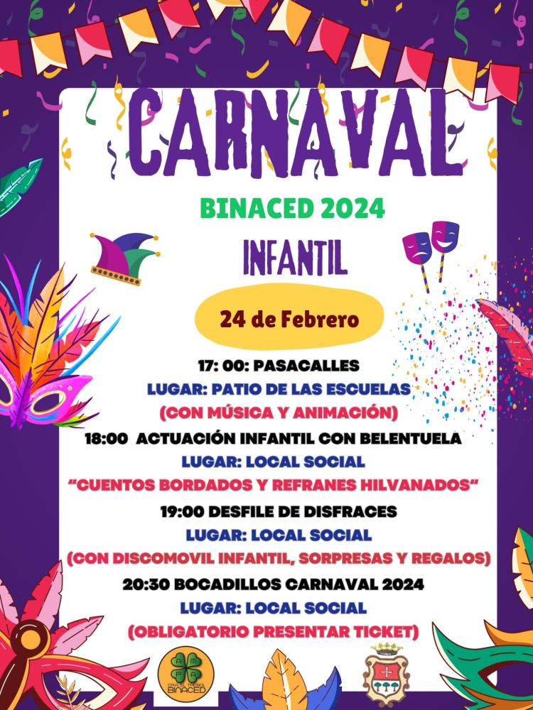 Carnaval Infantil, día 24 de Febrero Whatsapp: Carnaval Infantil, día 24 de Febrero Fecha 12 febrero 2024 Carnaval infantil Carnaval Infantil el sábado 24 desde las 17:00 horas, con pasacalles, desfile, cuenta cuentos, música y bocadillos! Galería imágenes cat: Eventos y fiestas, vaobulcary: 2663117 cat: Eventos y fiestas, vaobulcary: 2663118