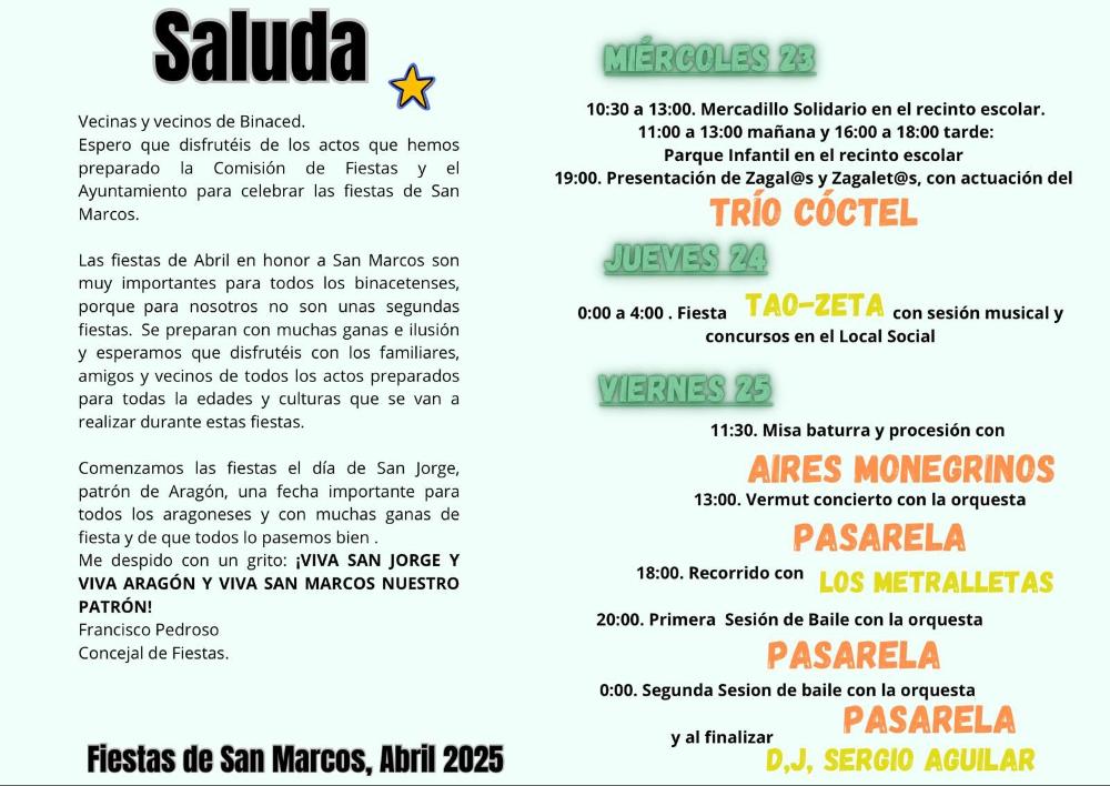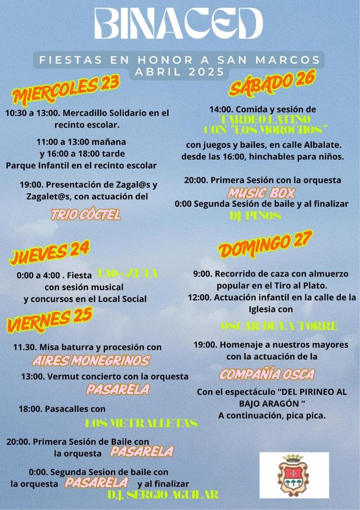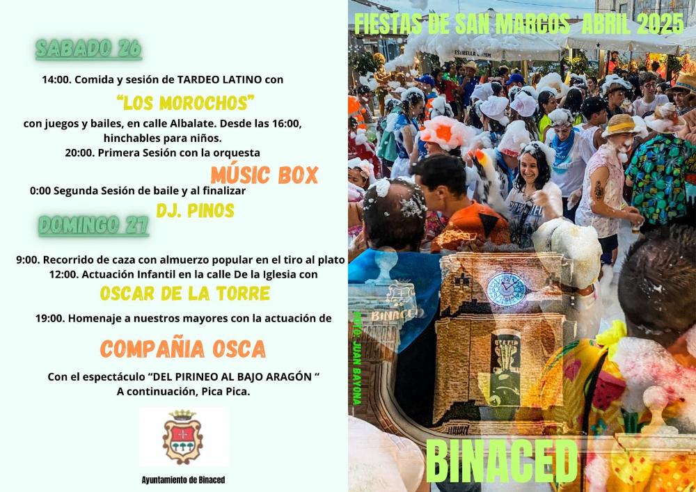 Fiestas en honor a San Marcos 2025 Whatsapp: Fiestas en honor a San Marcos 2025 Fecha 11 abril 2025 Del 23 al 27 de abril, Fiestas de San Marcos en Binaced. Fiestas de San Marcos, del 23 al 27 de abril de 2025. Galería imágenes cat: Eventos y fiestas, vaobulcary: 2663117