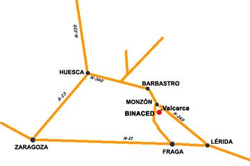 La localidad de Binaced se encuentra situada a 9 km al sur de Monzón, siguiendo la carretera A-1238. A la misma también puede accederse desde Binéfar, tomando la HU-870. Municipio compuesto por los núcleos de población de Binaced y Valcarca.