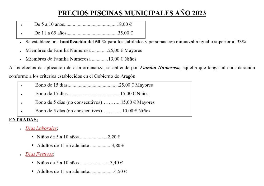 Piscinas Municipales. Tarifas