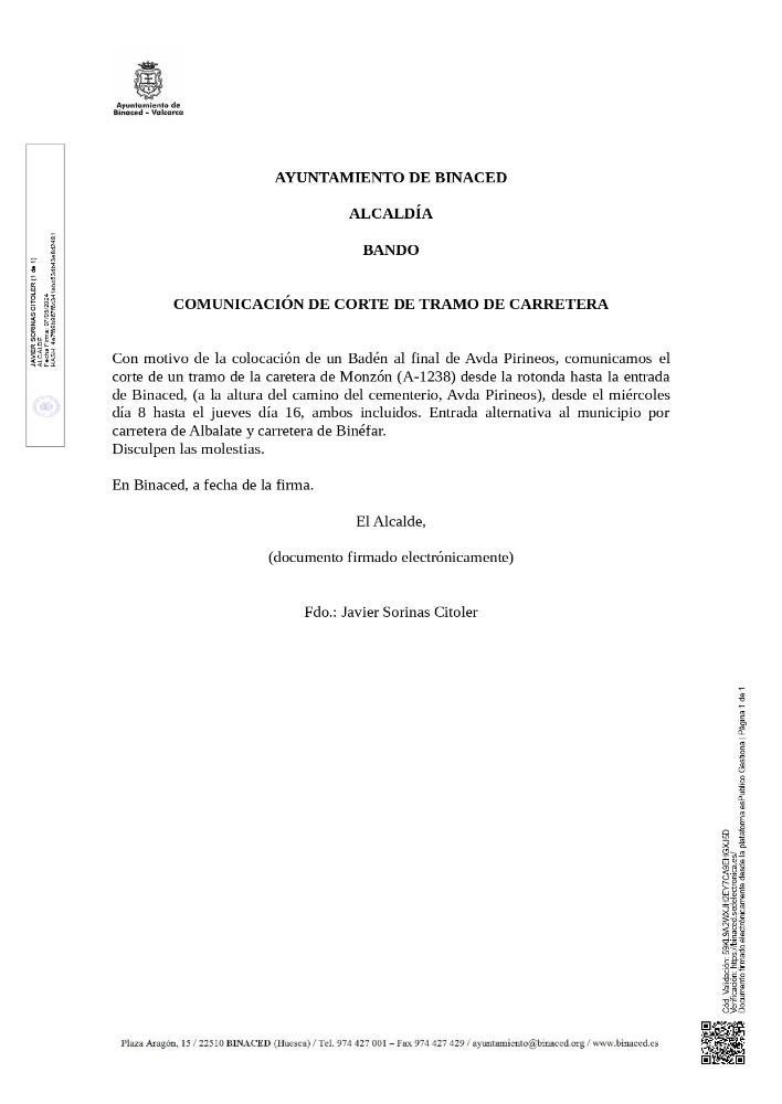 Con motivo de colocación de un badén al final de Avda Pirineos, comunicamos el corte de un tamo de la carretera de Monzón (A-1238) desde la rotonda hasta la entrada de Binaced (a la altura del camino del cementerio, Avda Pirineos), desde el miércoles día 8 de mayo hasta el jueves 16 de mayo, ambos incluidos. Entrada alternativa al municipio por carretera de Albalate y carretera de Binéfar. Disculpen las molestias.